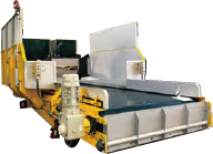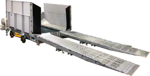ベルトコンベヤの後方より投入されたパッカー車(2t・4t)からの一般ごみを前方に搬出し、一般ごみ搬入検査の省力化を可能にしました。フォークリフトで移動するタイプのコンベヤです。